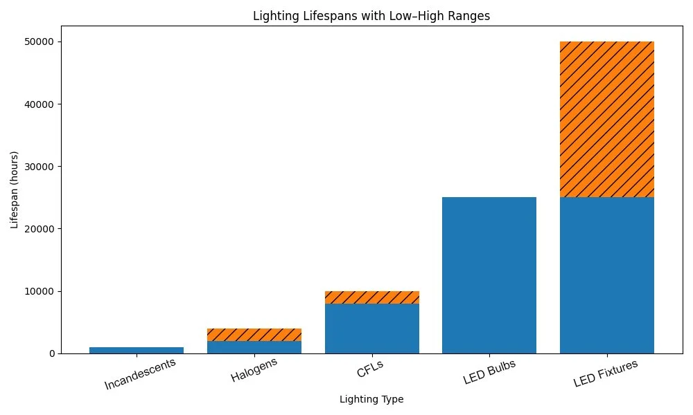 This means LEDs can last 25 to 50 times longer than incandescents and 2 to 5 times longer than CFLs or halogens.
