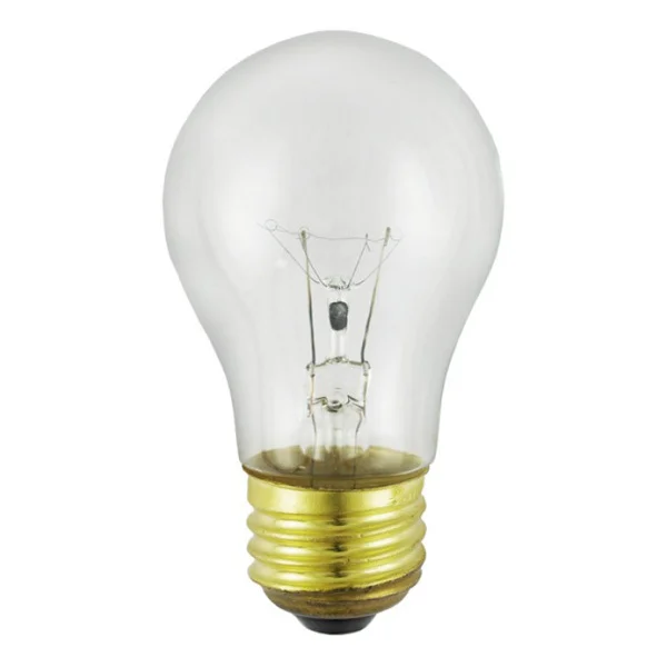 Ovens and Refrigerators – The typical light in your oven or fridge is the familiar incandescent A-shape. The difference is the slightly smaller, incandescent A15 bulb (instead of A19) is appliance rated. That means it is designed to consistently turn on even though the light is exposed to higher hot or lower cold temperatures for long periods of time. These bulbs are usually 25 or 40 watts, run on 130 Volts, and are often shatterproof.