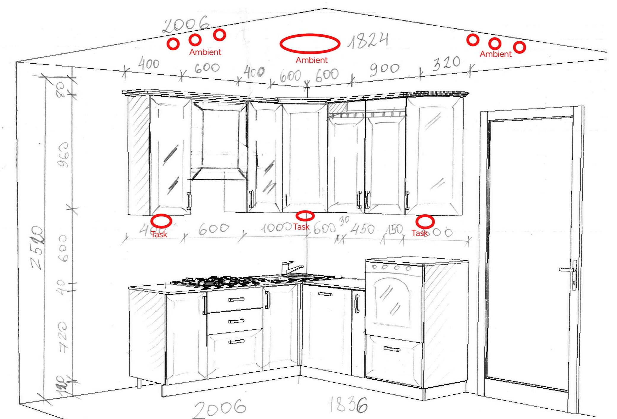 Recessed lighting layout design for small kitchen with task and ambient lights