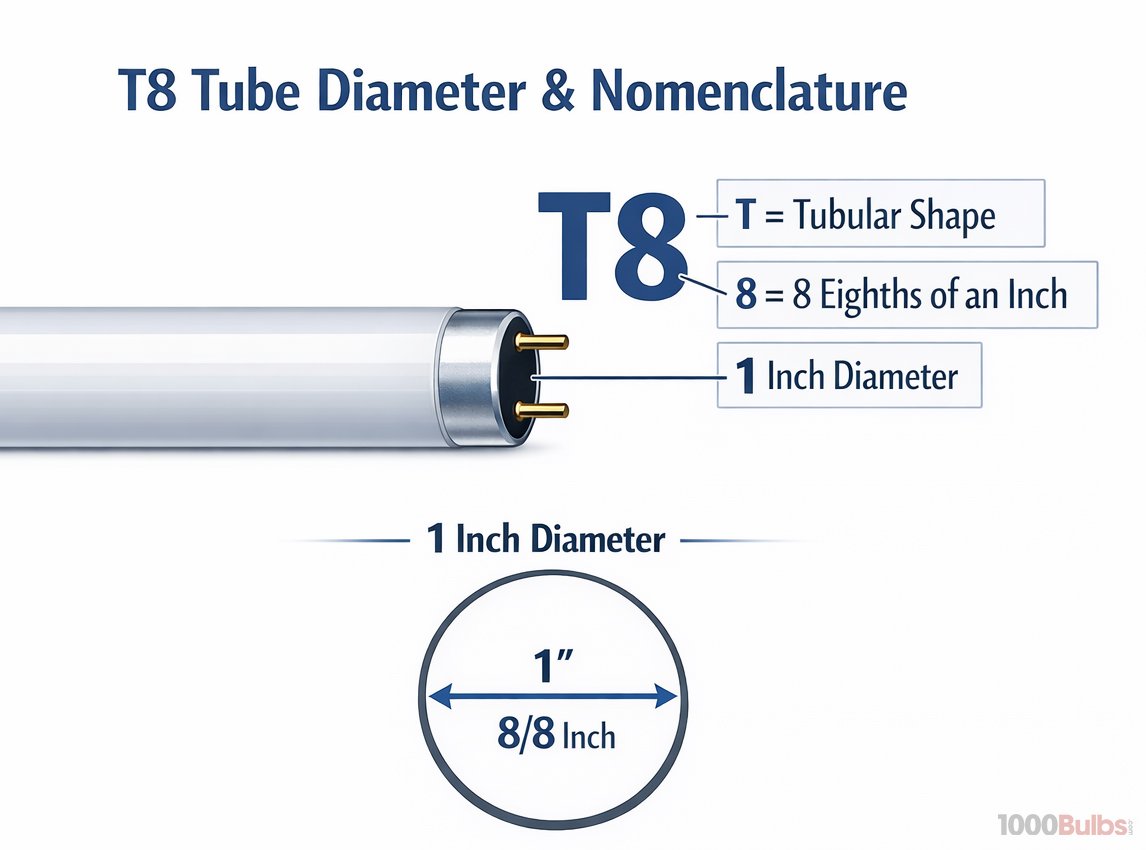 T8 refers to the diameter of the tube. The “T” stands for tubular, and the “8” means the tube is 8 eighths of an inch, or 1 inch in diameter.